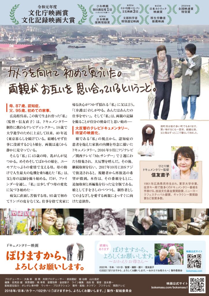 テレビディレクターの信友直子が、故郷の両親を撮影し反響を呼んだドキュメンタリーに、追加の取材と再編集をして映画化。80代後半で認知症になり自身の異変に戸惑う母と、95歳で家事と介護を担う父の姿を、葛藤しながら離れて暮らす娘の視点で映し出す。長年連れ添ってきた両親の日常を、ドキュメンタリー制作者の視点で真っすぐに見つめる。(2018年)