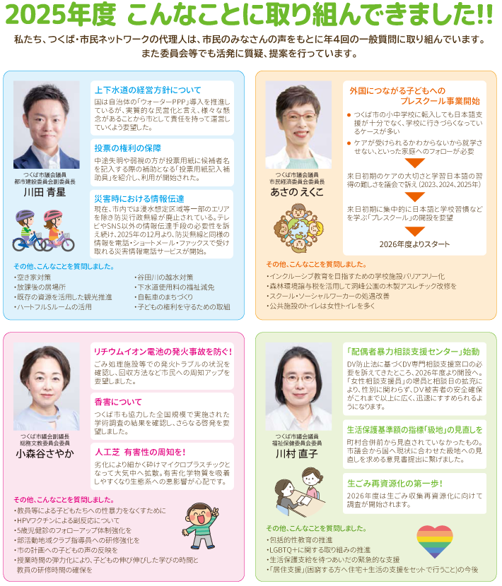 つくば・市民ネットワークは、既存のしくみによる政治ではなく、日々の生活を通して市民がネットワークを作り、まちづくりの主体として積極的な政治への参画を目指しています。